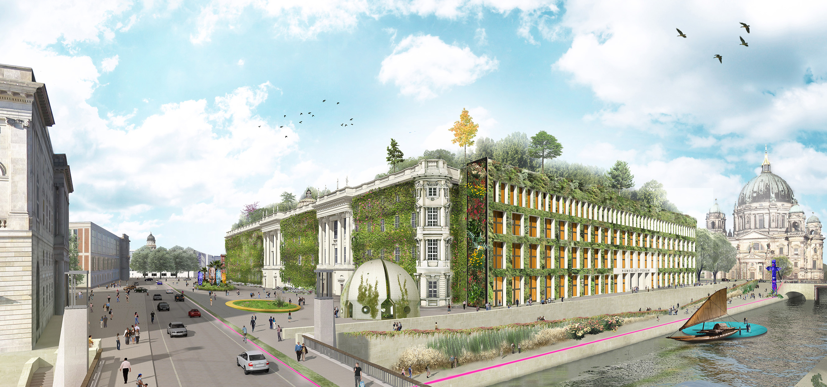 Es fehlen noch 50 Mio Euro für die Fertigstellung der Barockfassade. Was tun? Bereits vorhandene und finanzierte Fassadenteile werden montiert sowie alle noch offenen Flächen botanisch auf­regend begrünt und später sukzessive ergänzt. Eine derartige Gestaltung visualisiert nicht nur den interdisziplinären Denk­ansatz der Gebrüder Humboldt, sie symbolisiert auch die Herkunft der zukünftig be­her­bergten Sammlungen. Gleichzeitig steht eine grüne Fassade für ein innovatives Deutschland, indem Stadt neu gedacht wird.