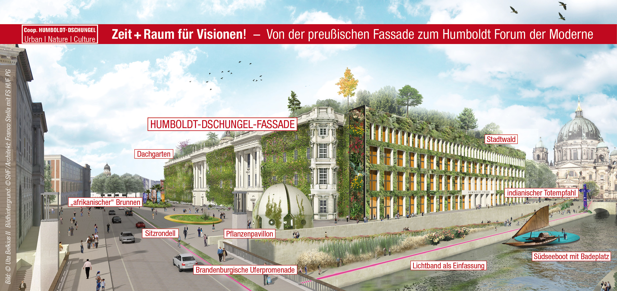 Wir wollen, dass das Humboldt Forum auch äußerlich zu einem Wahrzeichen einer humanistisch-­demokratischen Tradition wächst – für die die Gebrüder Humboldt standen – und zu einem abwechslungsreichen Ort, mit dem sich sowohl eine breite Berliner Stadtgesellschaft als auch Gäste aus verschiedensten Regionen identifizieren können. Ein künstlerischer „Humboldt-Dschungel“ sähe spektakulär aus, öffnet Herz und Geist im Sinne der Humboldts und könnte Gegner und Befürworter des „Barockschlosses“ versöhnen.